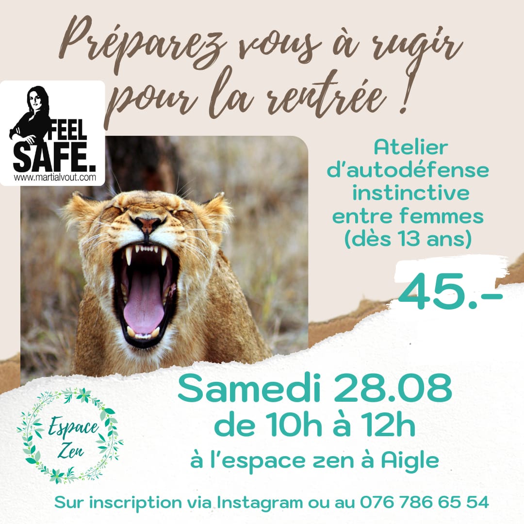 cette photo décrit l’atelier d’autodéfense du samedi 28 août 2021 à Aigle. Pour femmes dès 13 ans. Le workshop se déroulera à l’Espace Zen. Réservation au 076 786 65 54. L’autodéfense instinctive la plus utile et facile pour les femmes.